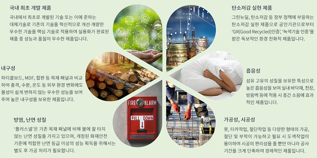섬유 소각 및 매립으로 인한 환경오염문제가 대두되면서 저탄소, 친환경 경제에 따른 글로벌 시장의 요구 증대에 부응하기 위해 자연과 인체에 무해한 섬유패널 브랜드를 런칭하였습니다.