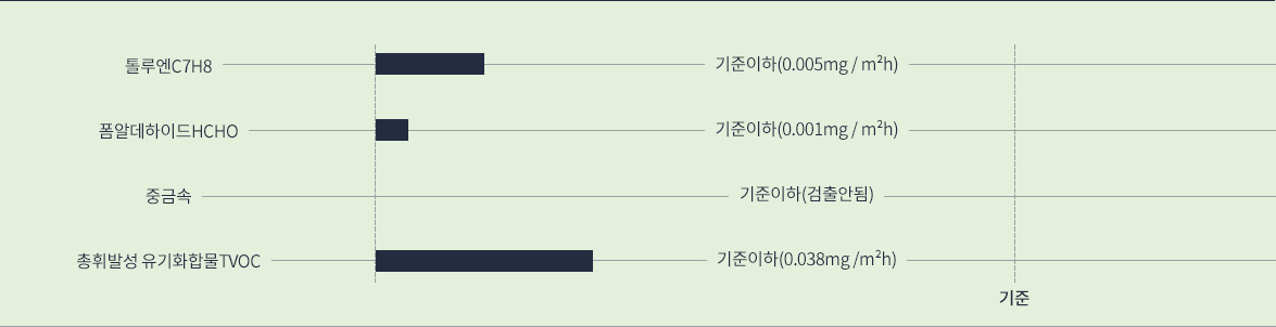 | 유해물질 방출 | 포름알데하이드 방출량 | mg/m²*h(L) | 불검출 | KEITI | - | |